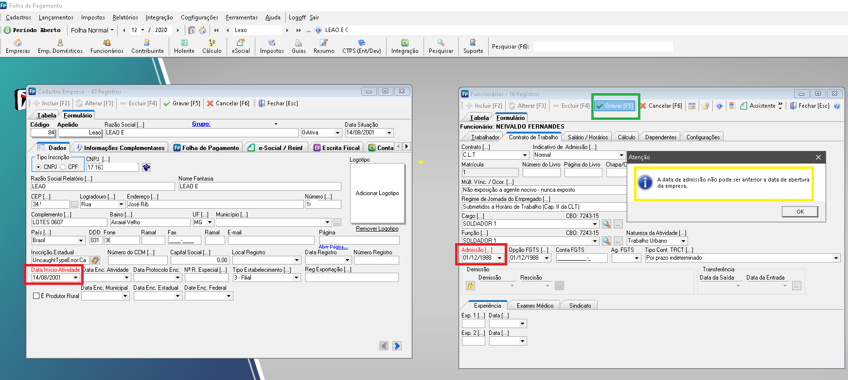 Se você tentou gravar um cadastro de funcionário no FX Folha e exibiu a mensagem "A data de admissão não pode ser anterior a data de abertura da empresa."