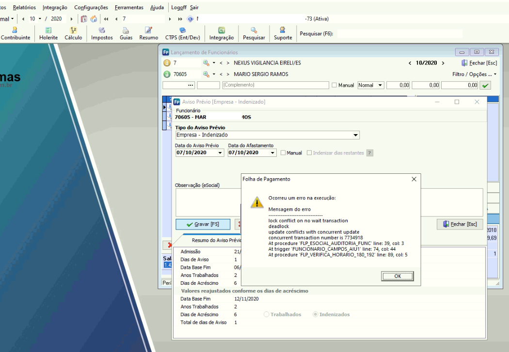 Caso o sistema exiba essa mensagem entre em contato com o suporte urgente.