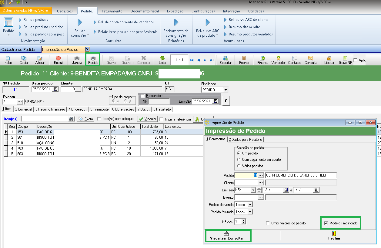 2 - E na tela de impressão do pedido marcar a mesma opção "Modelo simplificado"