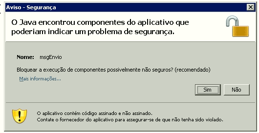 "O Java encontrou componentes do aplicativo que poderiam indicar um problema de segurança.