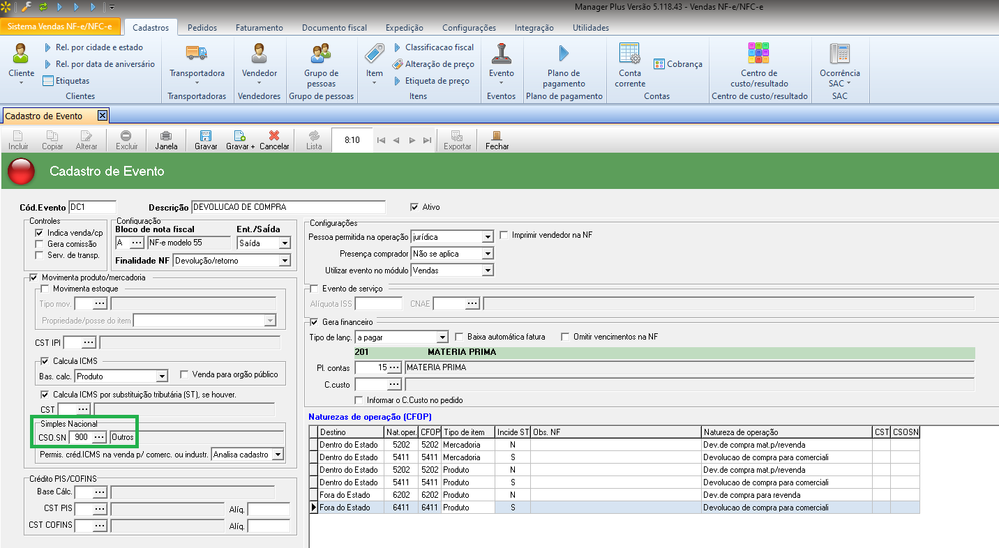2 - Se não houver diferença nos valores, verifique no cadastro do evento se foi informado o "900 no campo de CSOSN" ou informar CST = 90.
