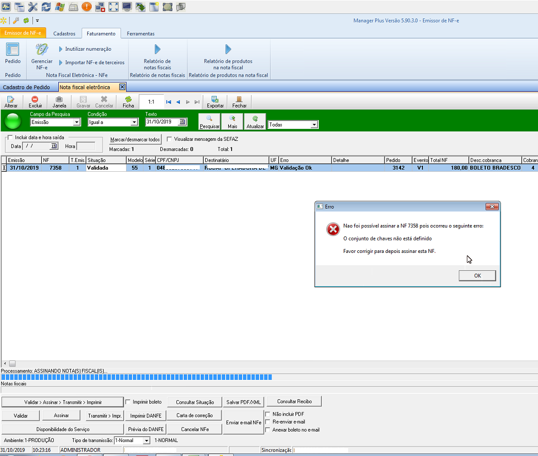 Caso encontre o erro "O conjunto de Chaves não está definido" no momento da emissão da Nota Fiscal eletrônica (NFe), conforme imagem abaixo em anexo.