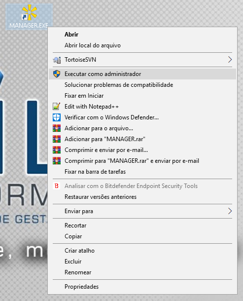 Nesse caso bastar clicar no icone(atalho manager) do sistema e escolha a opção "Executar como administrador".
