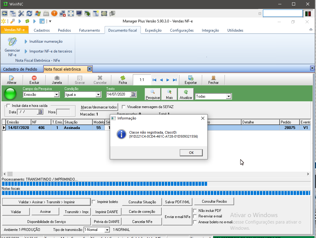 Ao tentar emitir a nota fiscal e deu erro de "Classe não registrada, ClassID", reinstale o capicom.