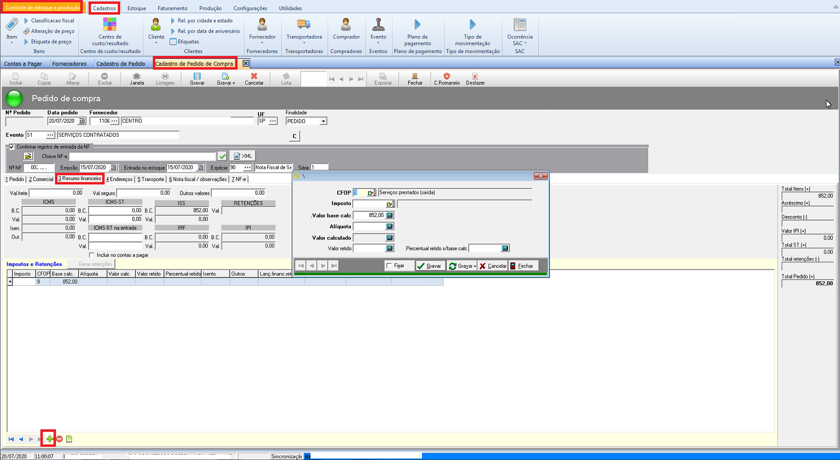 1- Acesse o módulo de controle de estoque, cadastro e depois "Cadastro Pedido de compra".