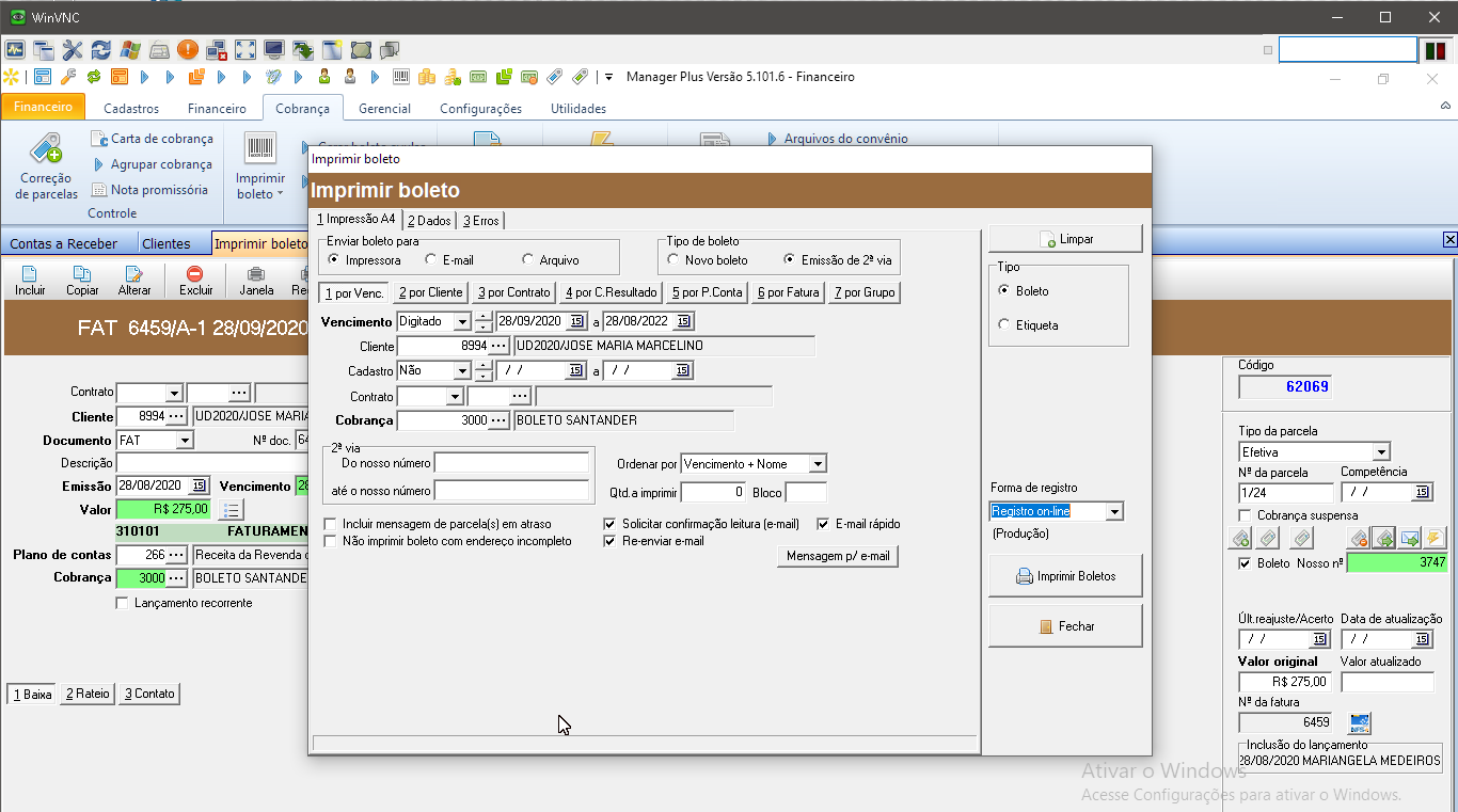 Ao tentar gerar remessa de boleto deu erro "UF inválida", provavelmente no cadastro do cliente na aba 2(Complemento A) a UF não está preenchida.