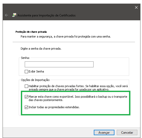 isso ocorre quando o certificado não foi instalado com a opção "Marcar esta chave como exportável" marcada.