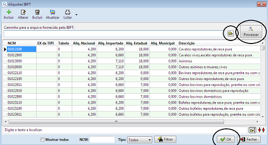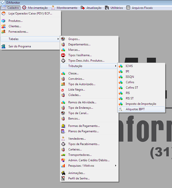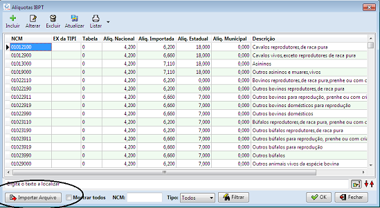 Menu: Cadastro > Tabelas > Tributação > Alíquotas IBPT