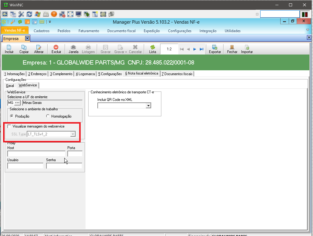 Se ao tentar transmitir a Nota fiscal e a mensagem abaixo, verifique as configurações do certificado no cadastro da empresa e no internet explorer: