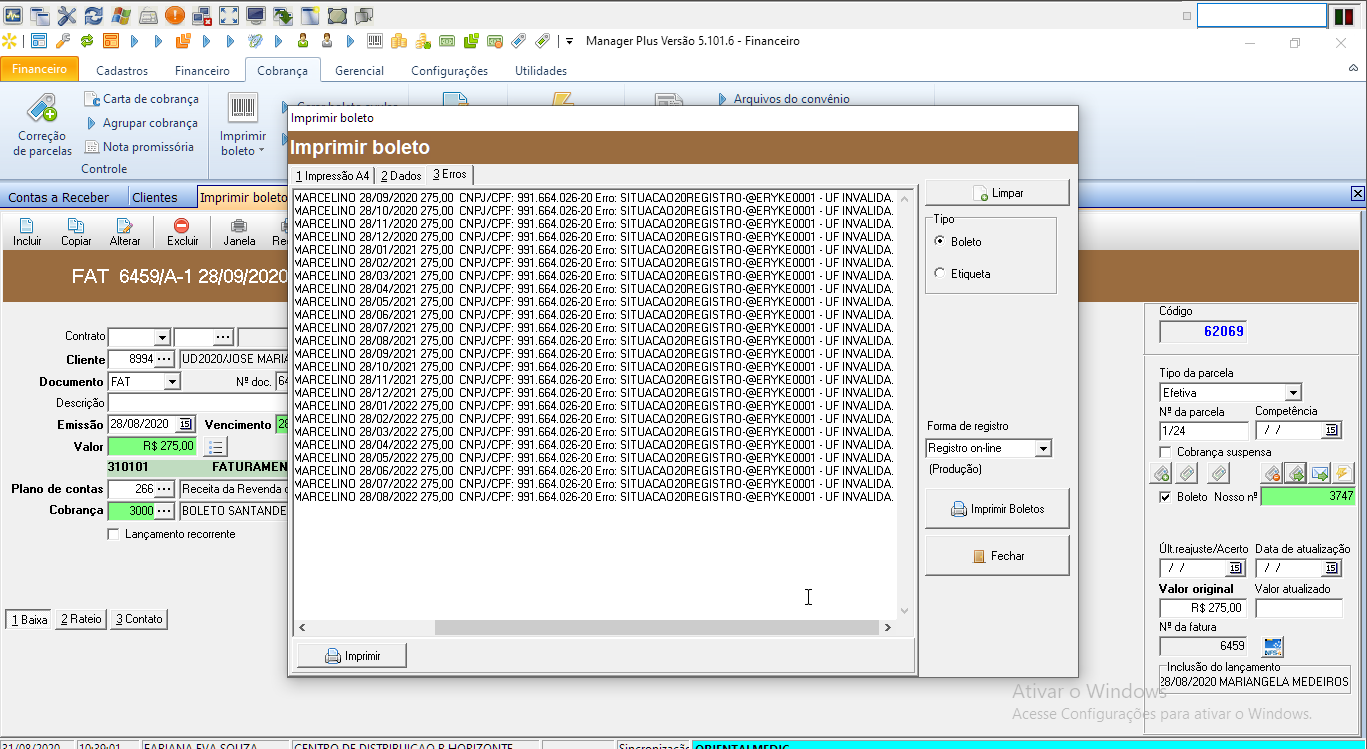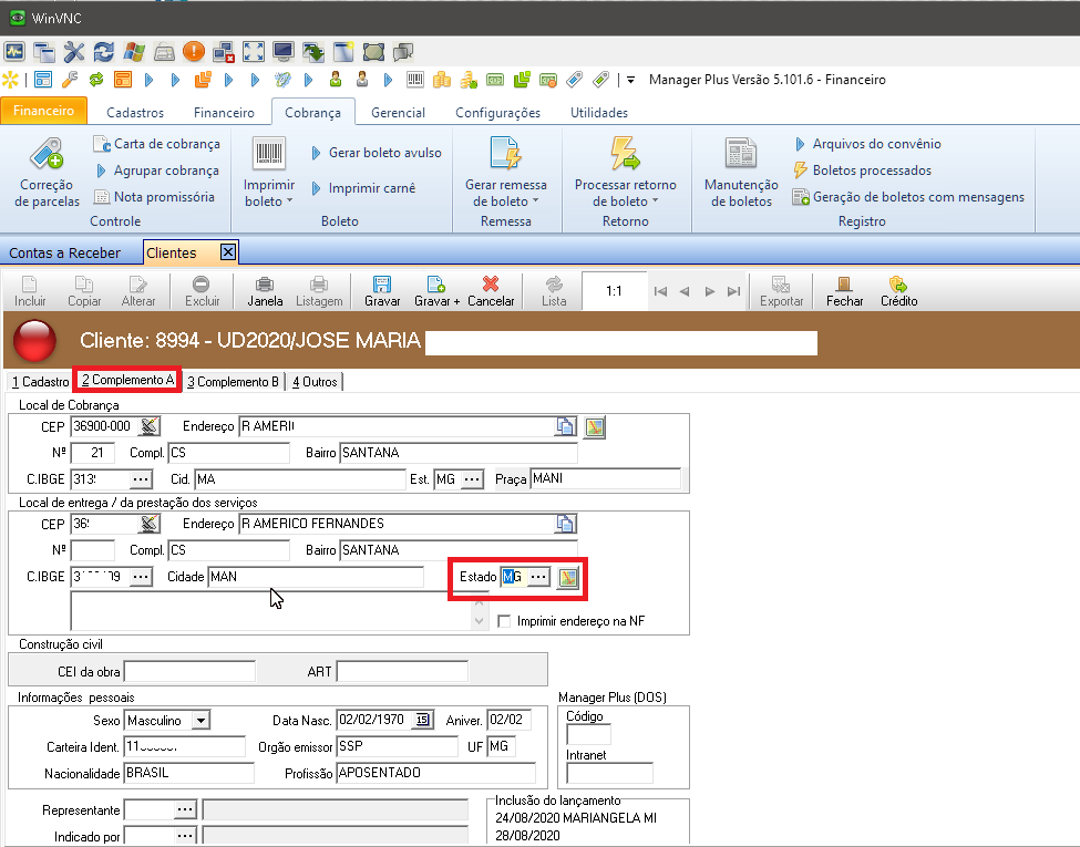 Ao tentar gerar remessa de boleto deu erro "UF inválida", provavelmente no cadastro do cliente na aba 2(Complemento A) a UF não está preenchida.