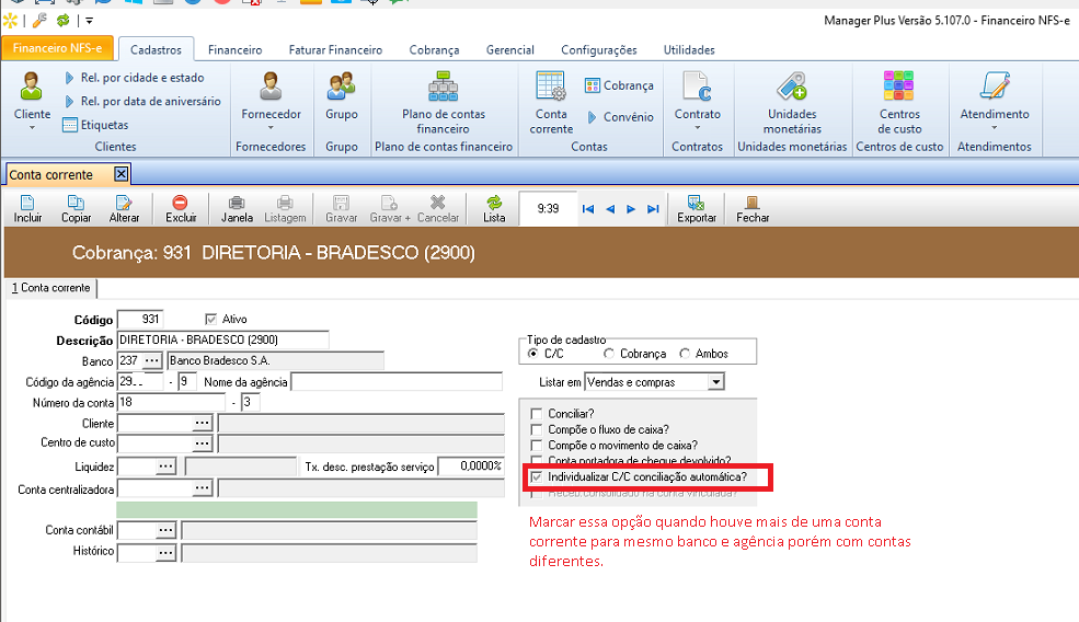 Acesse o cadastro de conta corrente e depois clique alterar, depois basta marcar o campo "Individualizar C/C conciliação automática?"
