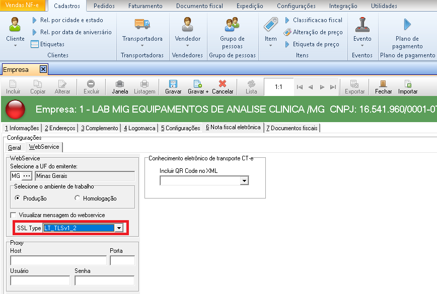 Este erro ocorre quando está faltando definir parâmetros no cadastro da empresa, acessa a aba 6(Nota fiscal eletrônica), depois o menu "WebService" e preencha o campo "SSL Type" conforme imagem em anexo.